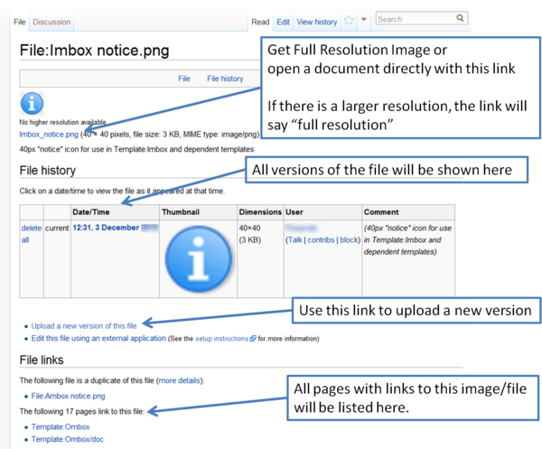 The most important elements of a file page, include "Upload a new version of this file" location, are shown below. See: Help:Images and Help:Files for more information.